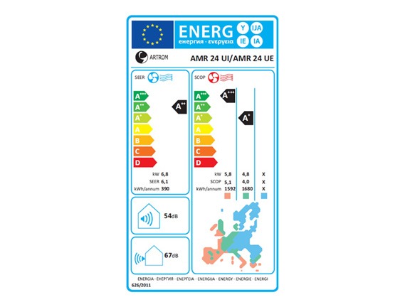 - Sistema Split de pared de 6.8kW: Compuesto por una unidad exterior AMR-24 UE y una unidad interior AMR-24 UI, alcanzando las 5856 frigorías a potencia nominal.